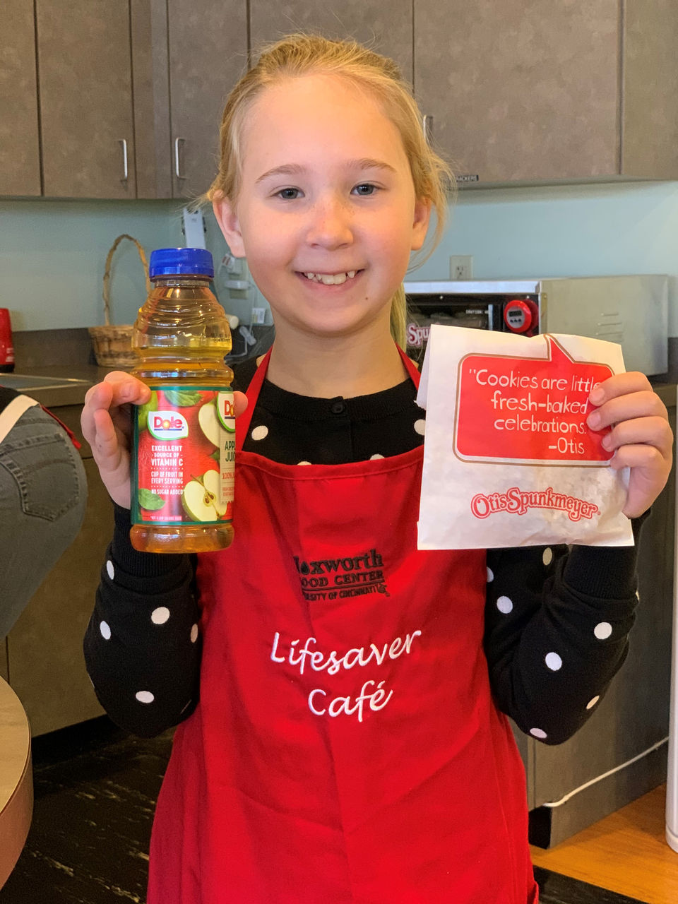 “One day, I noticed that no one was here making popcorn and cookies, so I found the sign on the fridge asking for volunteers,” Livi says. “I asked my mom to call the number so we could come volunteer and make cookies and popcorn for blood donors.”